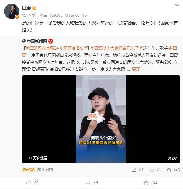 这次宣布复出开演唱会,田震也明确表示,不是为了“捞金”,而是为了圆自己和老歌迷的梦。