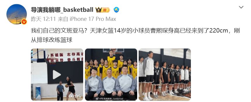 然而,近日,根据知情人士透露,中国女篮又冒出一个2米20的天才大个子了。据悉,这名天才中锋来自于天津女篮,名字为曹熙琛,今年只有14岁,但身高已经长到了2米20。而且,根据该知情人士透露,曹熙琛原先并不是练篮球的,在进入到篮球项目之前,她是学习排球的。只不过,由于后来身高长得非常快,最终不得不放弃排球,转而练起了篮球。